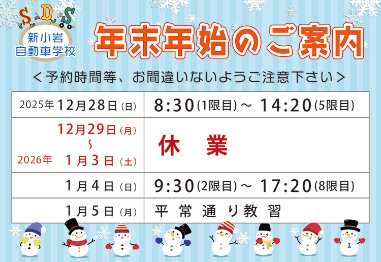 - 【教習料金改定のお知らせ】2025年12月から一部の教習料金を変更させていただきます。(普通車、準中型車、中型車、審査<準中型車・中型車>)各料金ページをご確認下さい。