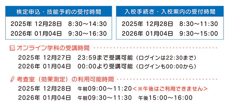 - 年末年始のご案内と年末年始のオンライン学科休業のお知らせをアップしました。